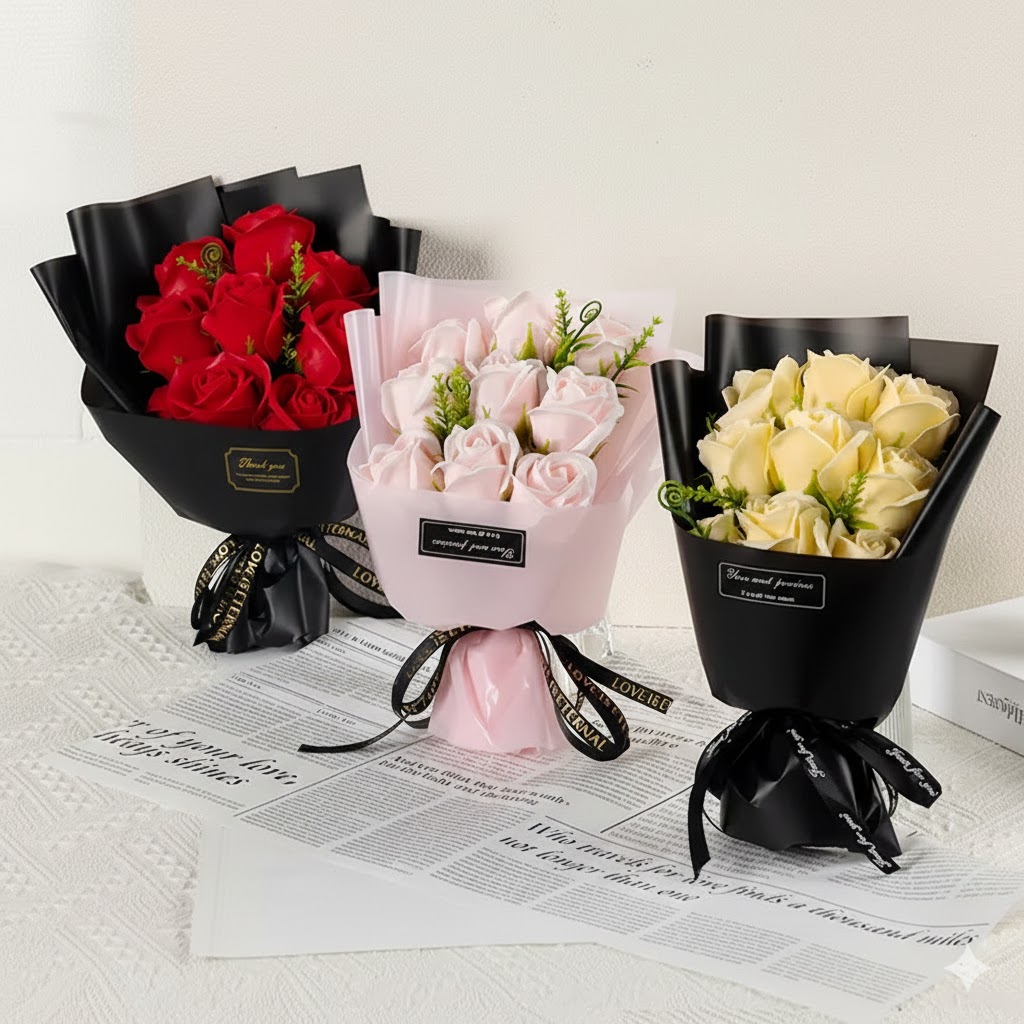 Beautiful soap roses in elegant wrapped packaging — the sweetest surprise that lasts forever, smells amazing, and requires no water!